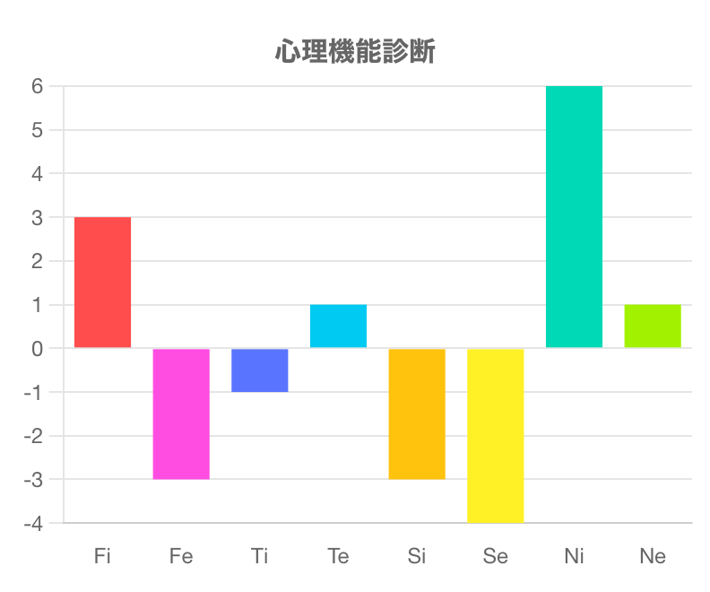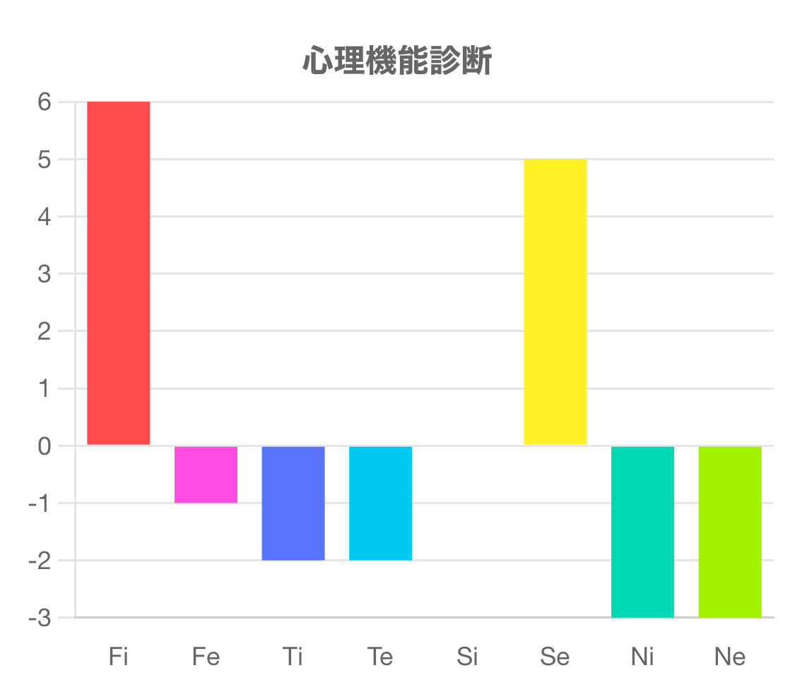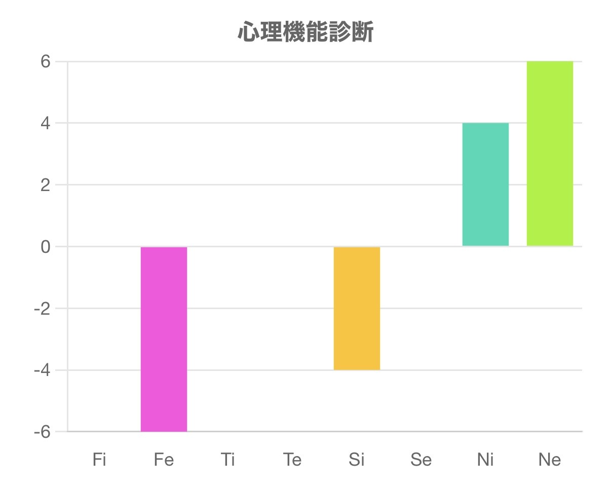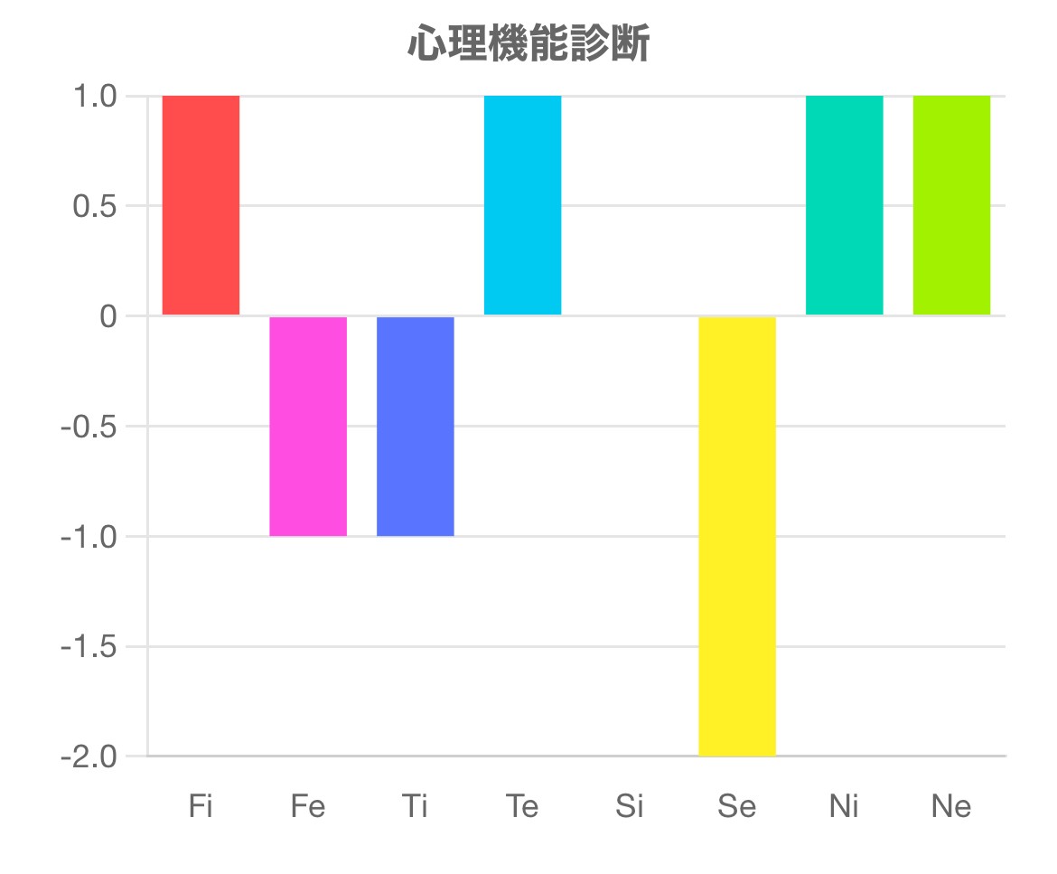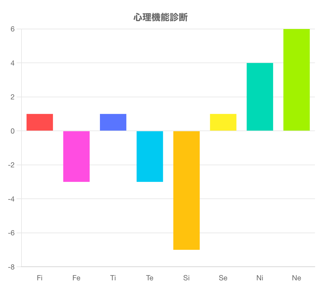 この診断テストは、Fi(内向的感情)、Fe(外向的感情)、Ti(内向的思考)、Te(外向的思考)、Si(内向的感覚)、Se(外向的感覚)、Ni(内向的直観)、Ne(外向的直観)の強さを測るものです。
