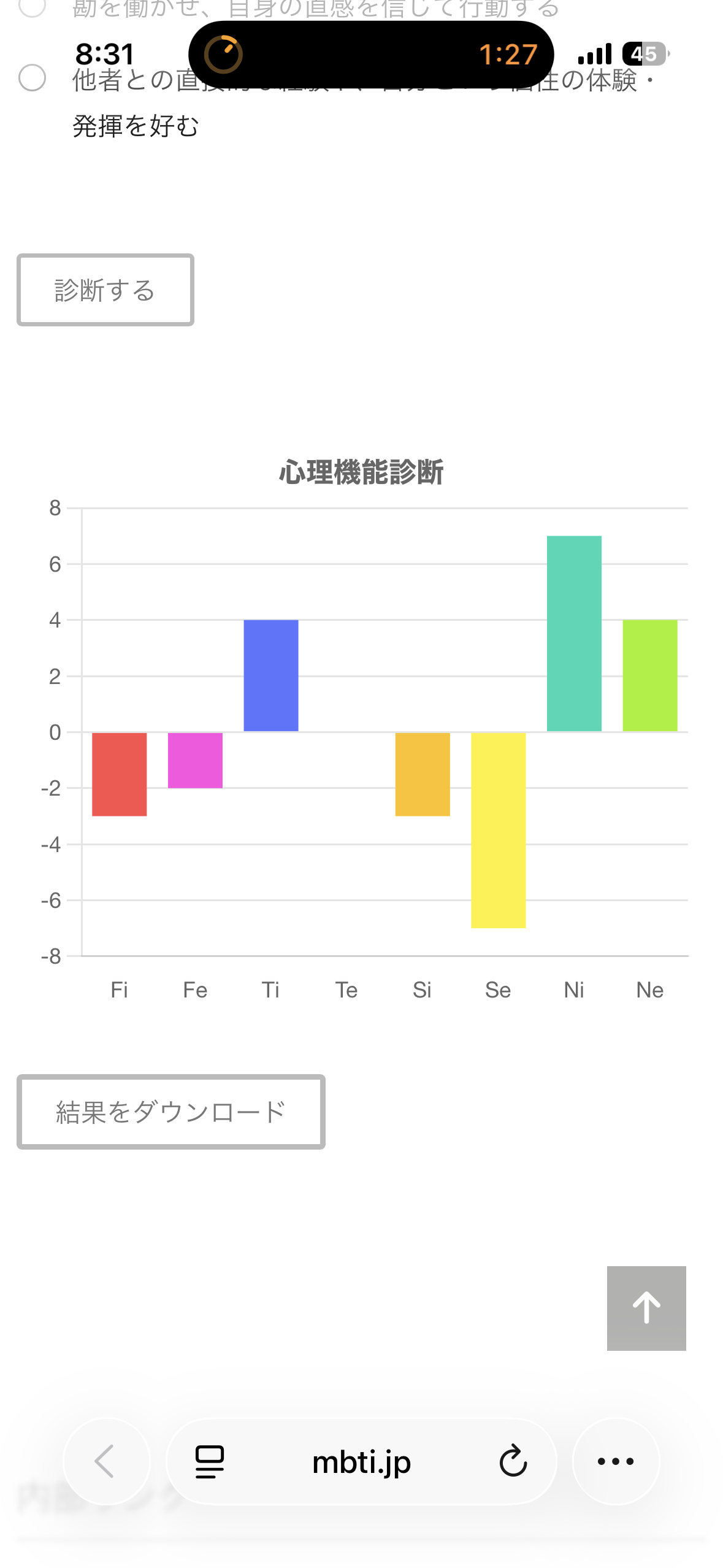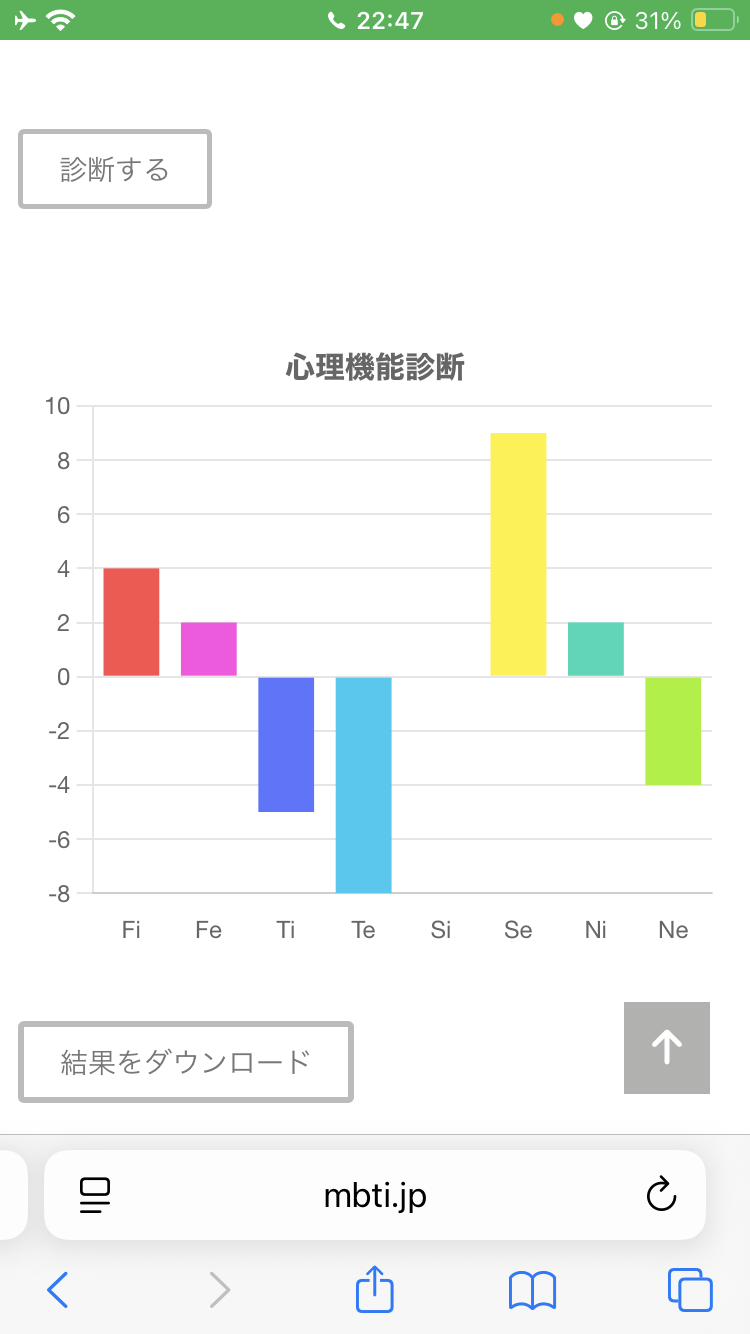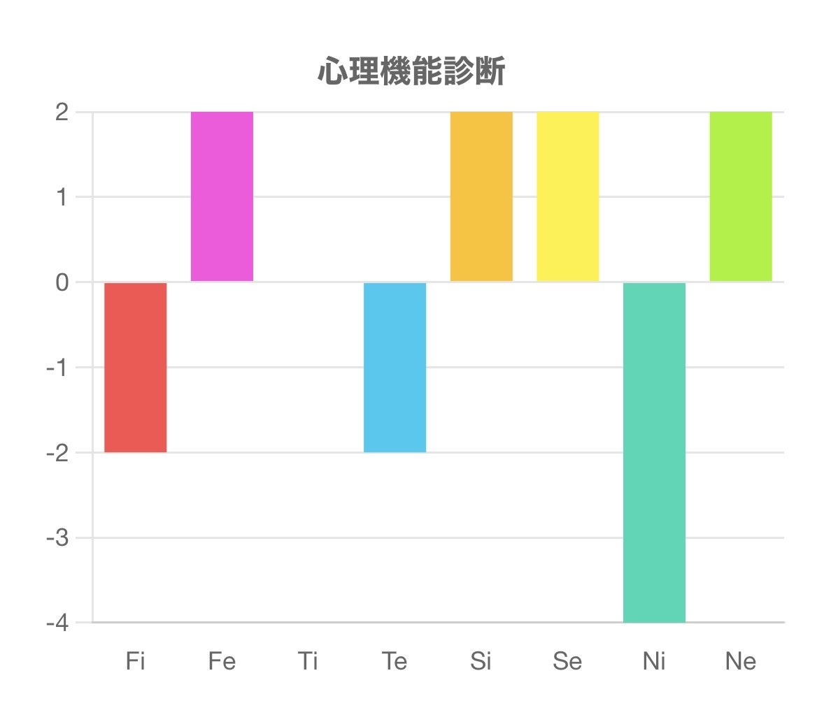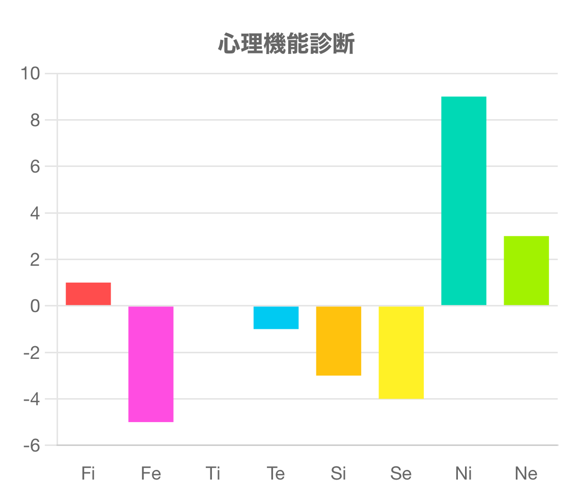 この診断テストは、Fi(内向的感情)、Fe(外向的感情)、Ti(内向的思考)、Te(外向的思考)、Si(内向的感覚)、Se(外向的感覚)、Ni(内向的直観)、Ne(外向的直観)の強さを測るものです。