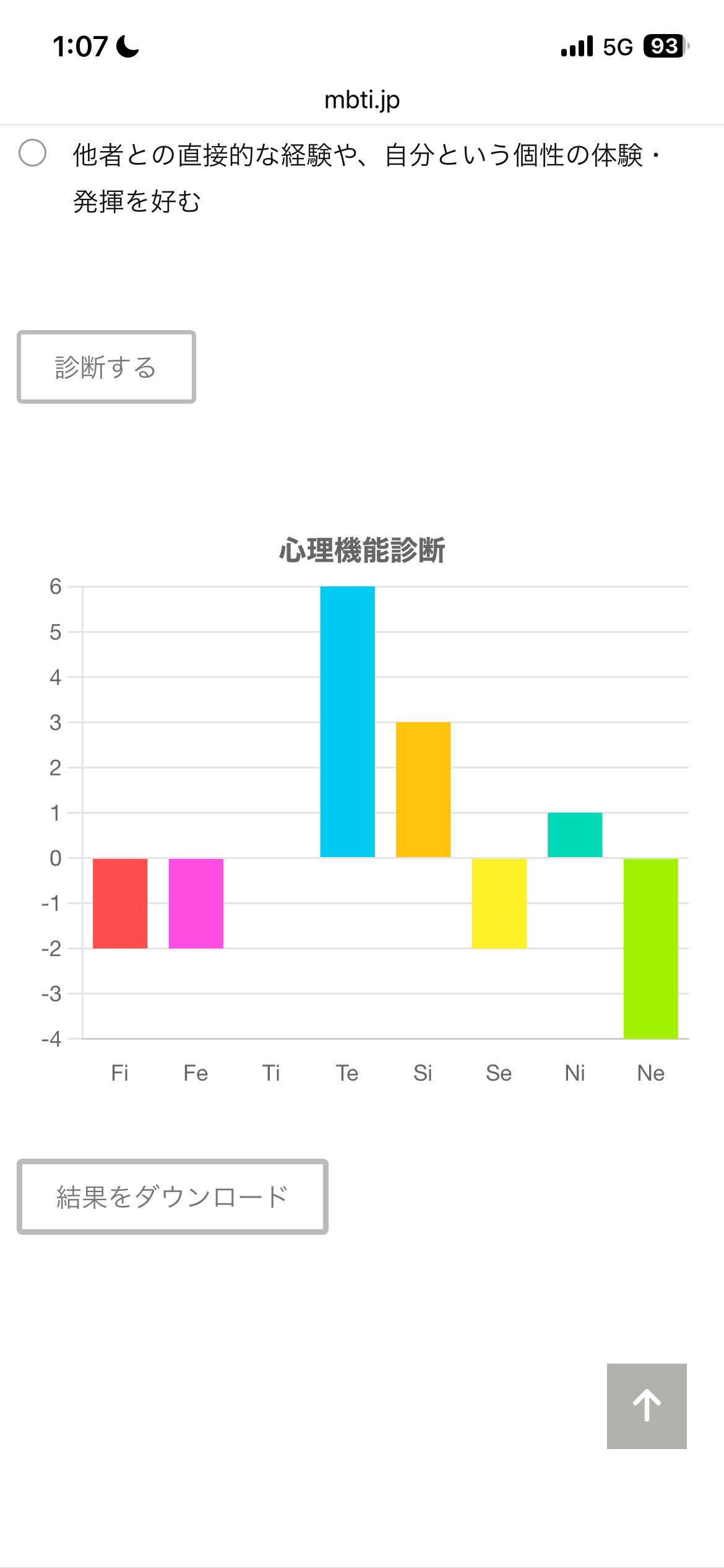 この診断テストは、Fi(内向的感情)、Fe(外向的感情)、Ti(内向的思考)、Te(外向的思考)、Si(内向的感覚)、Se(外向的感覚)、Ni(内向的直観)、Ne(外向的直観)の強さを測るものです。