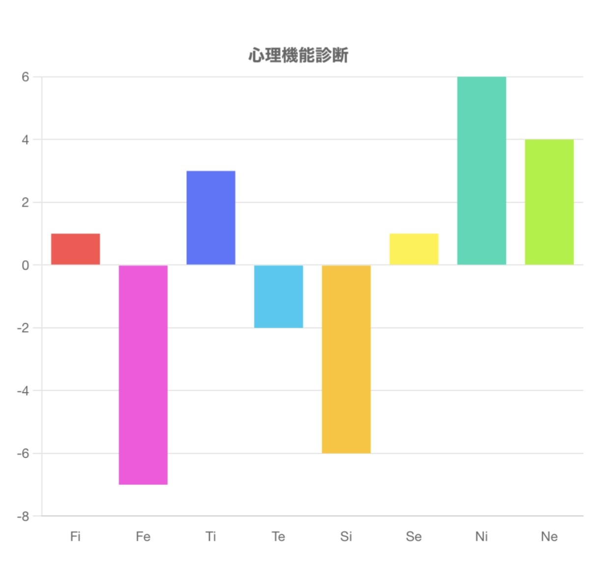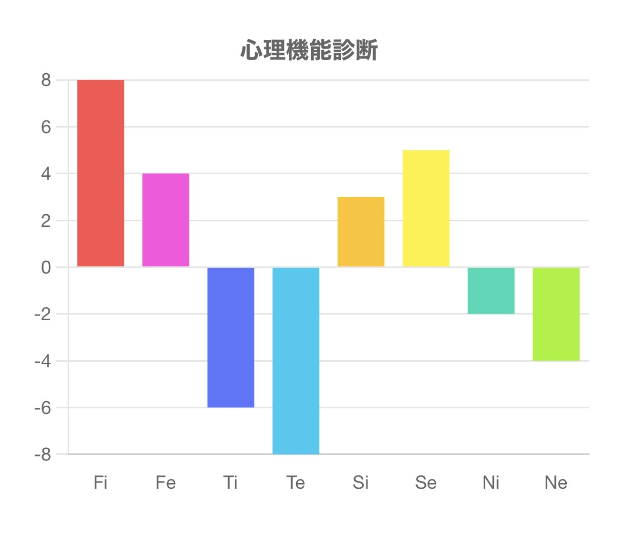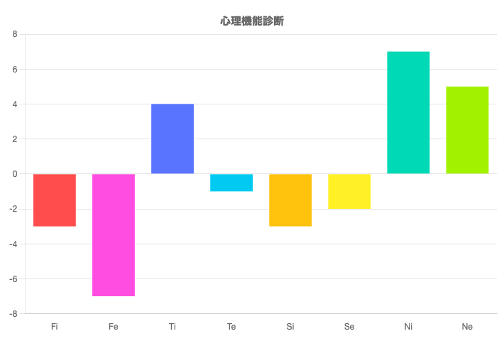 この診断テストは、Fi(内向的感情)、Fe(外向的感情)、Ti(内向的思考)、Te(外向的思考)、Si(内向的感覚)、Se(外向的感覚)、Ni(内向的直観)、Ne(外向的直観)の強さを測るものです。