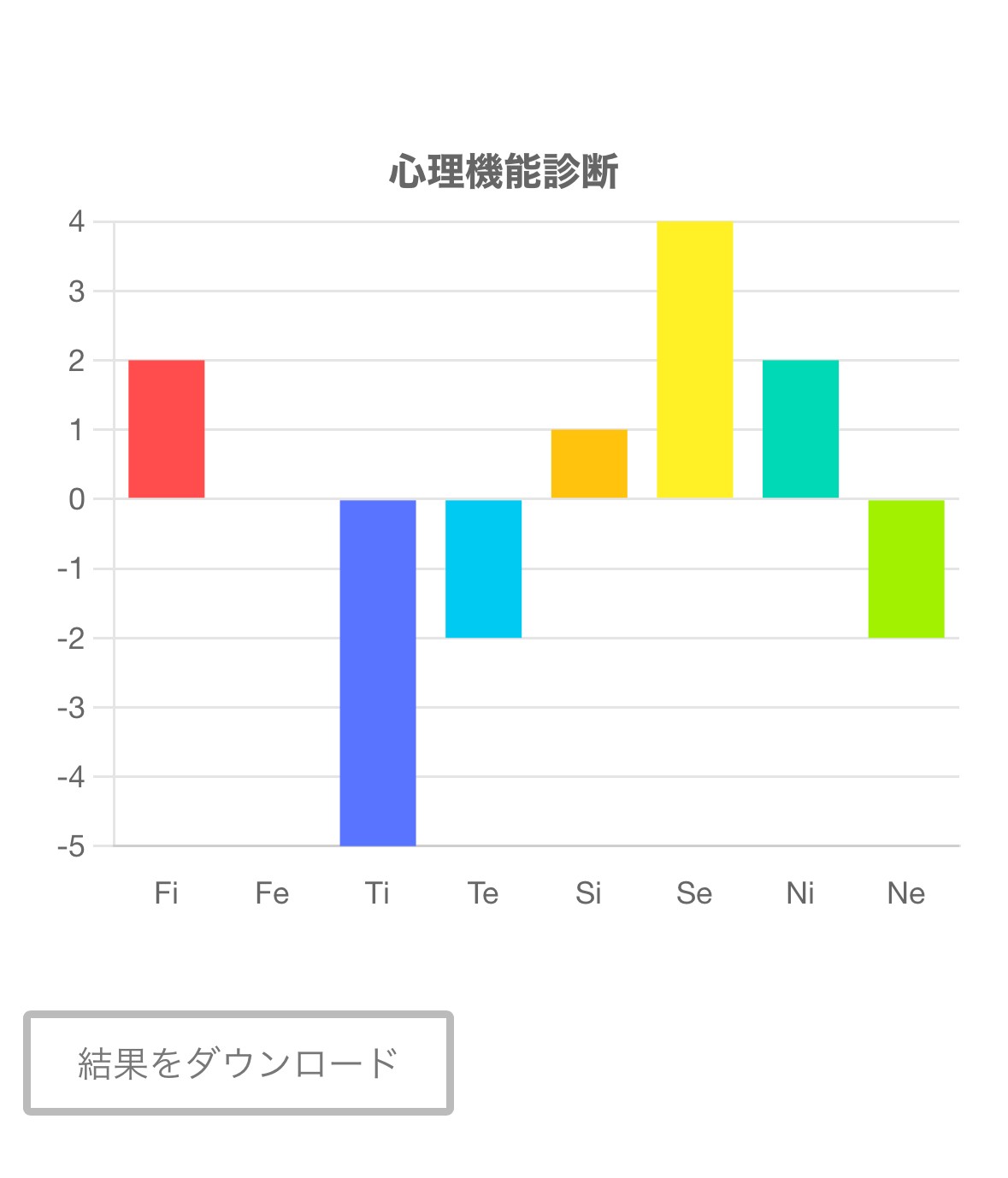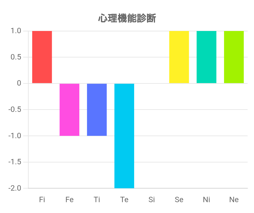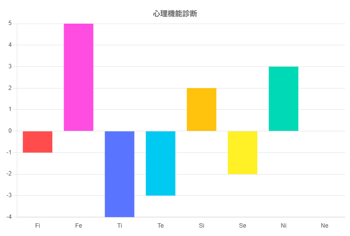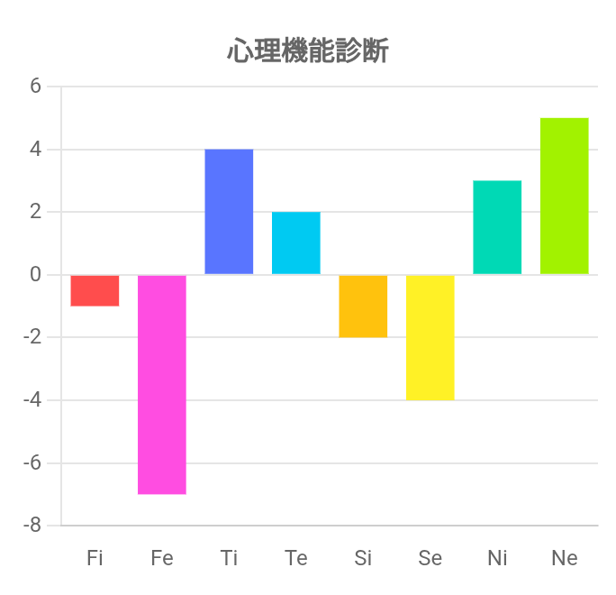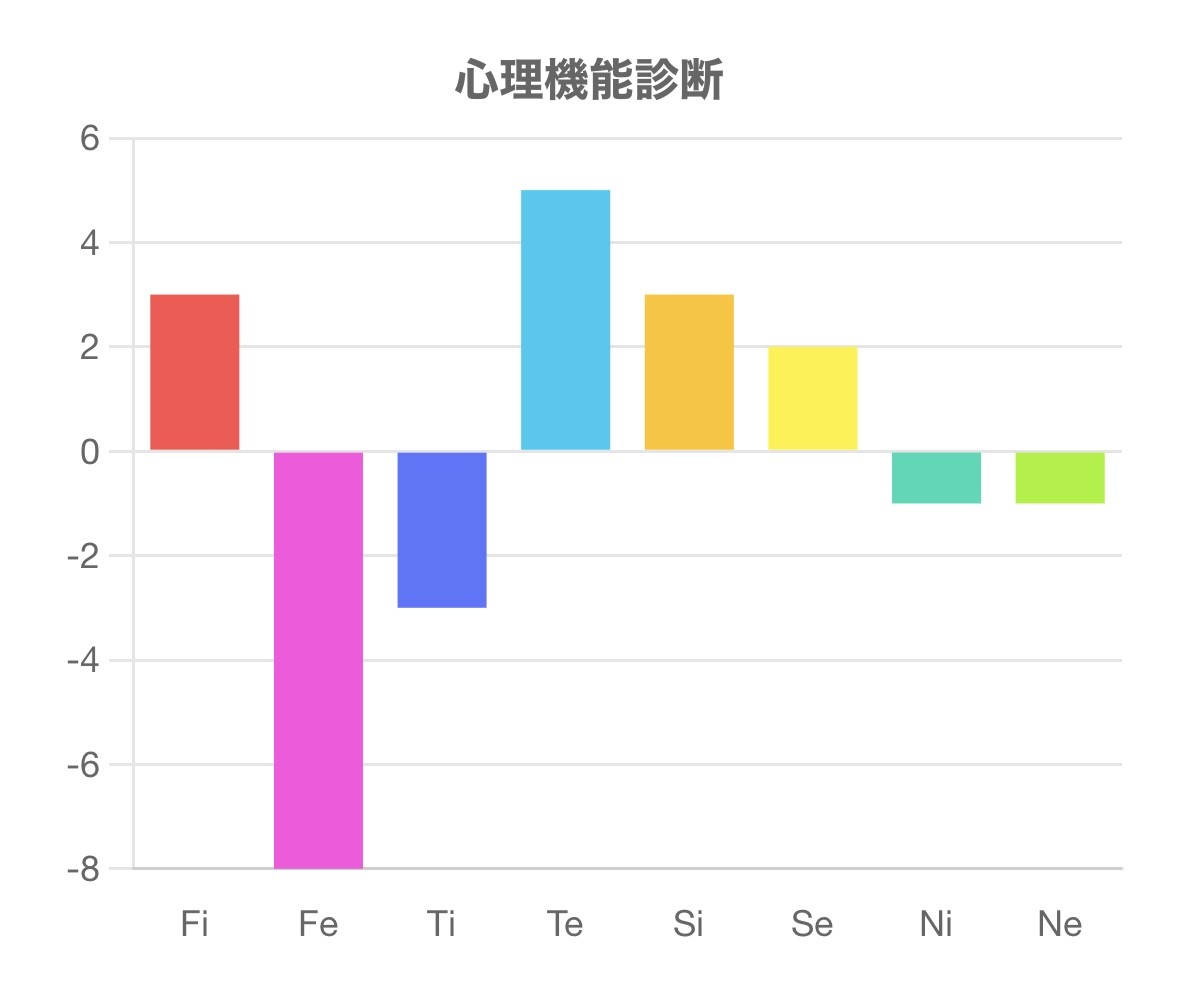 この診断テストは、Fi(内向的感情)、Fe(外向的感情)、Ti(内向的思考)、Te(外向的思考)、Si(内向的感覚)、Se(外向的感覚)、Ni(内向的直観)、Ne(外向的直観)の強さを測るものです。