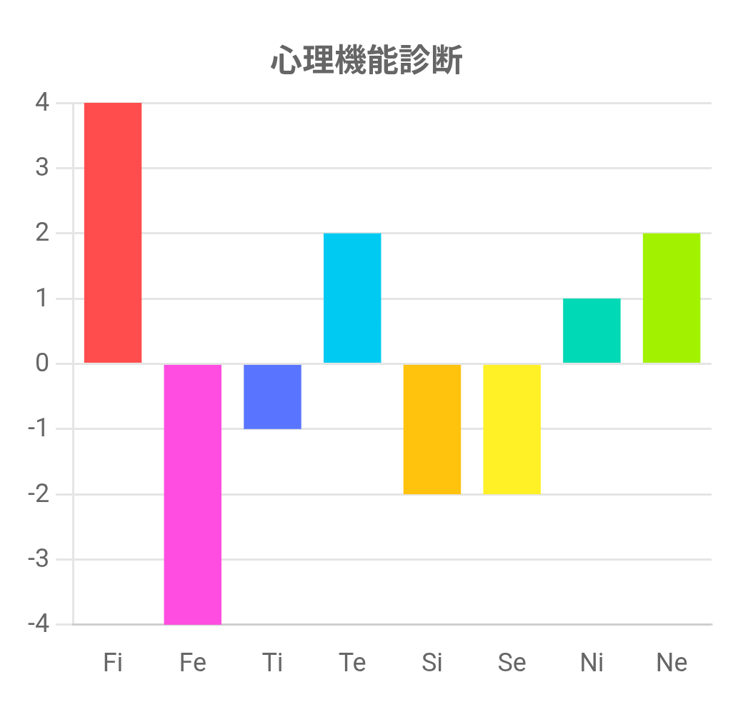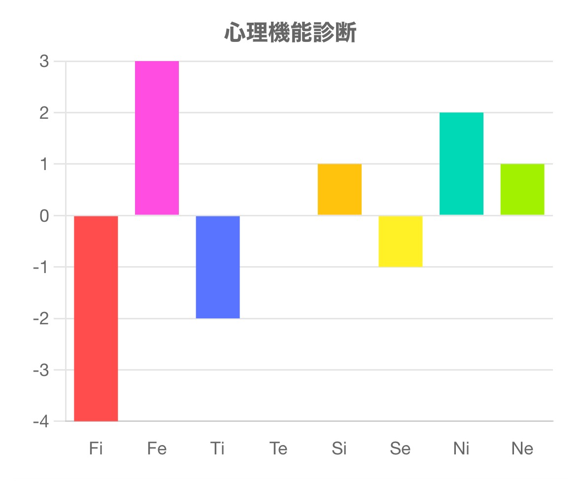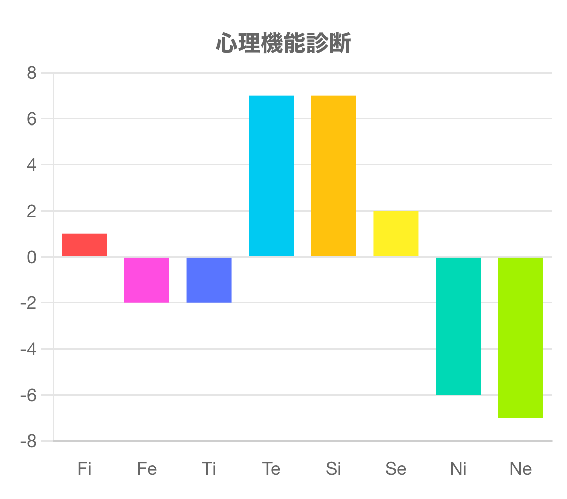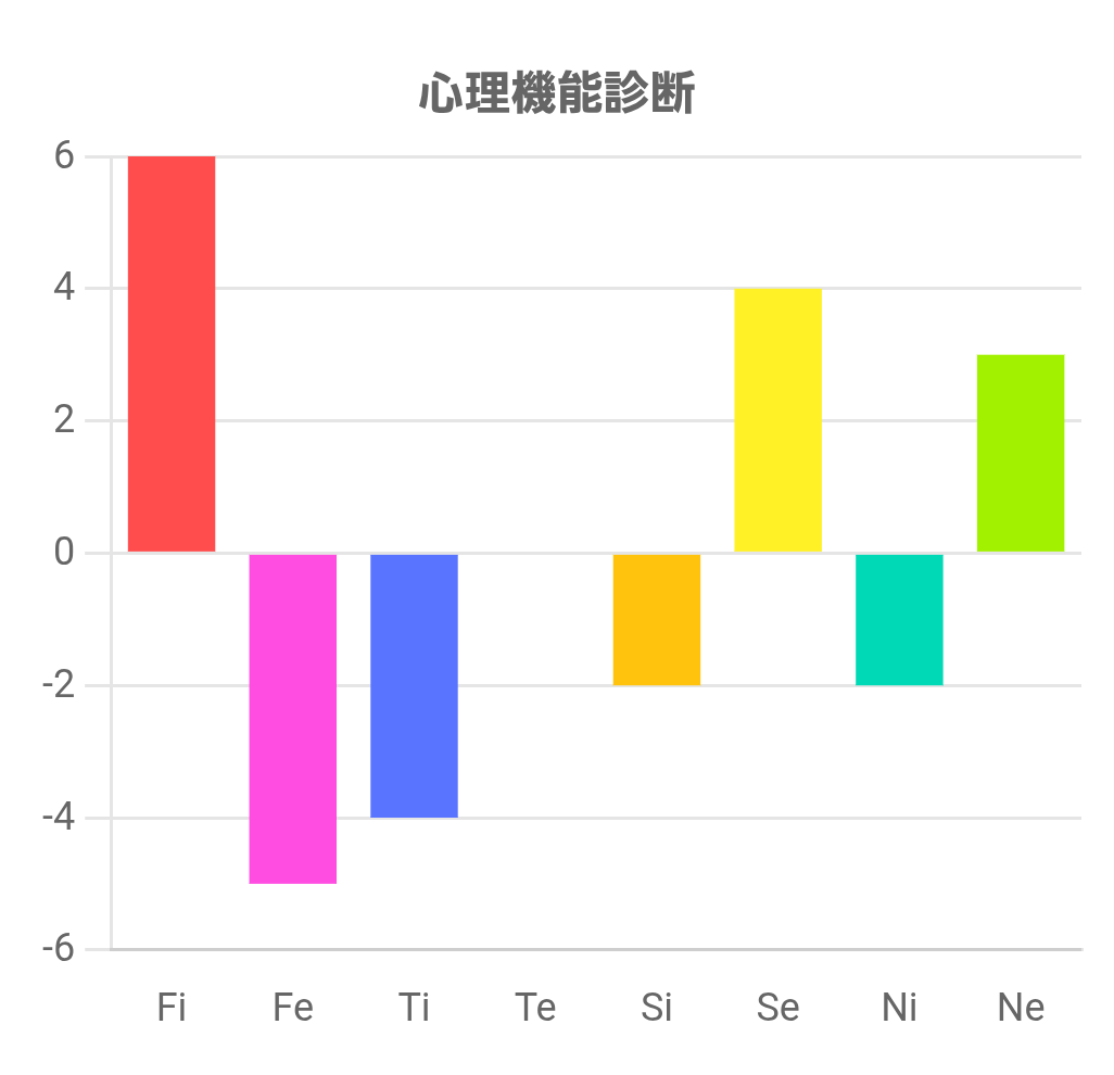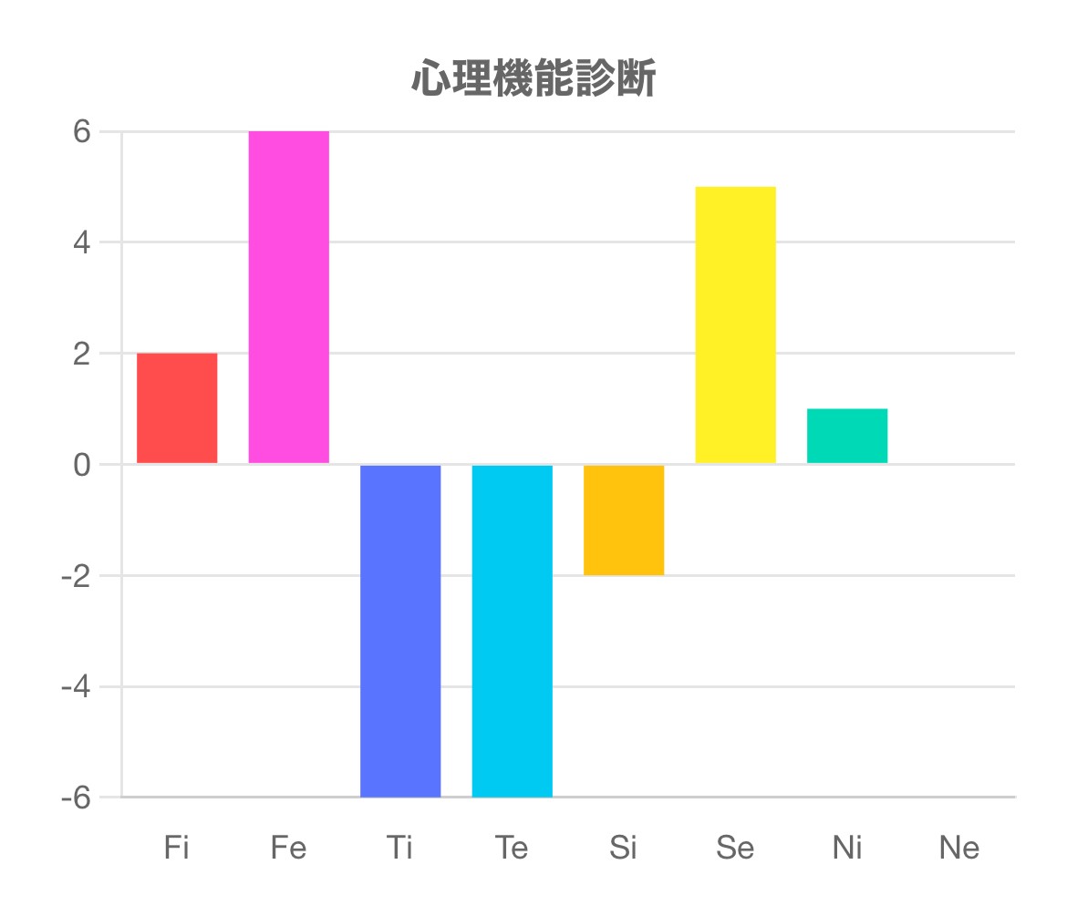 この診断テストは、Fi(内向的感情)、Fe(外向的感情)、Ti(内向的思考)、Te(外向的思考)、Si(内向的感覚)、Se(外向的感覚)、Ni(内向的直観)、Ne(外向的直観)の強さを測るものです。