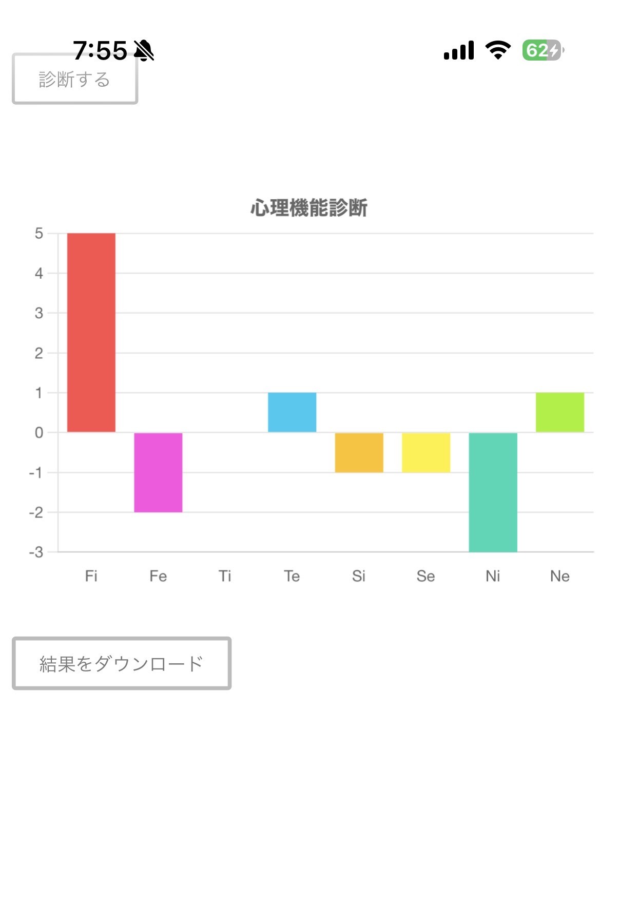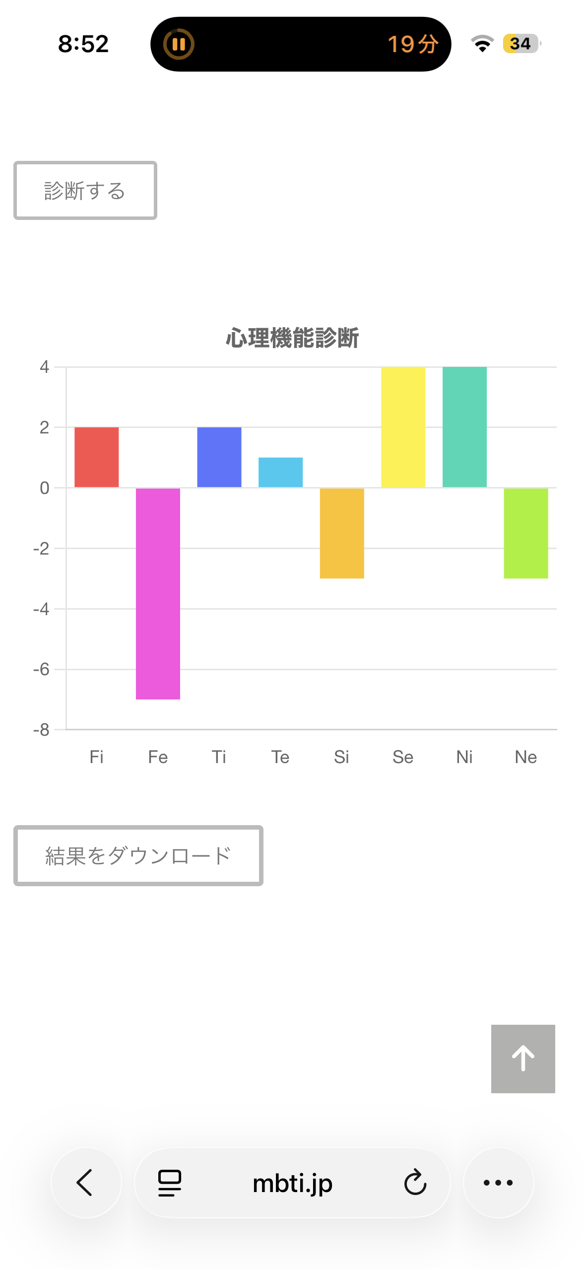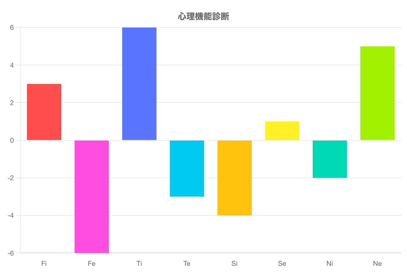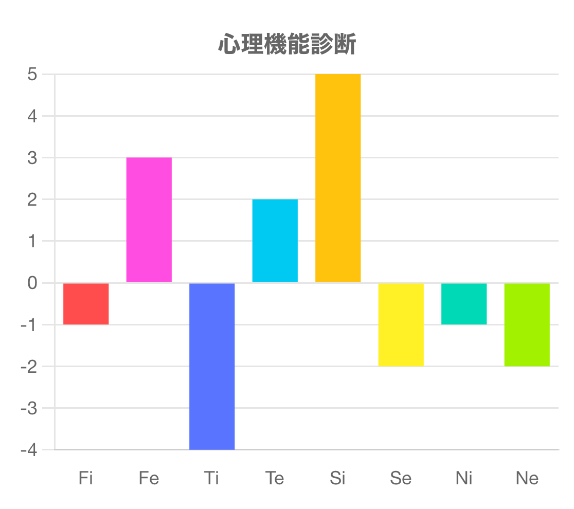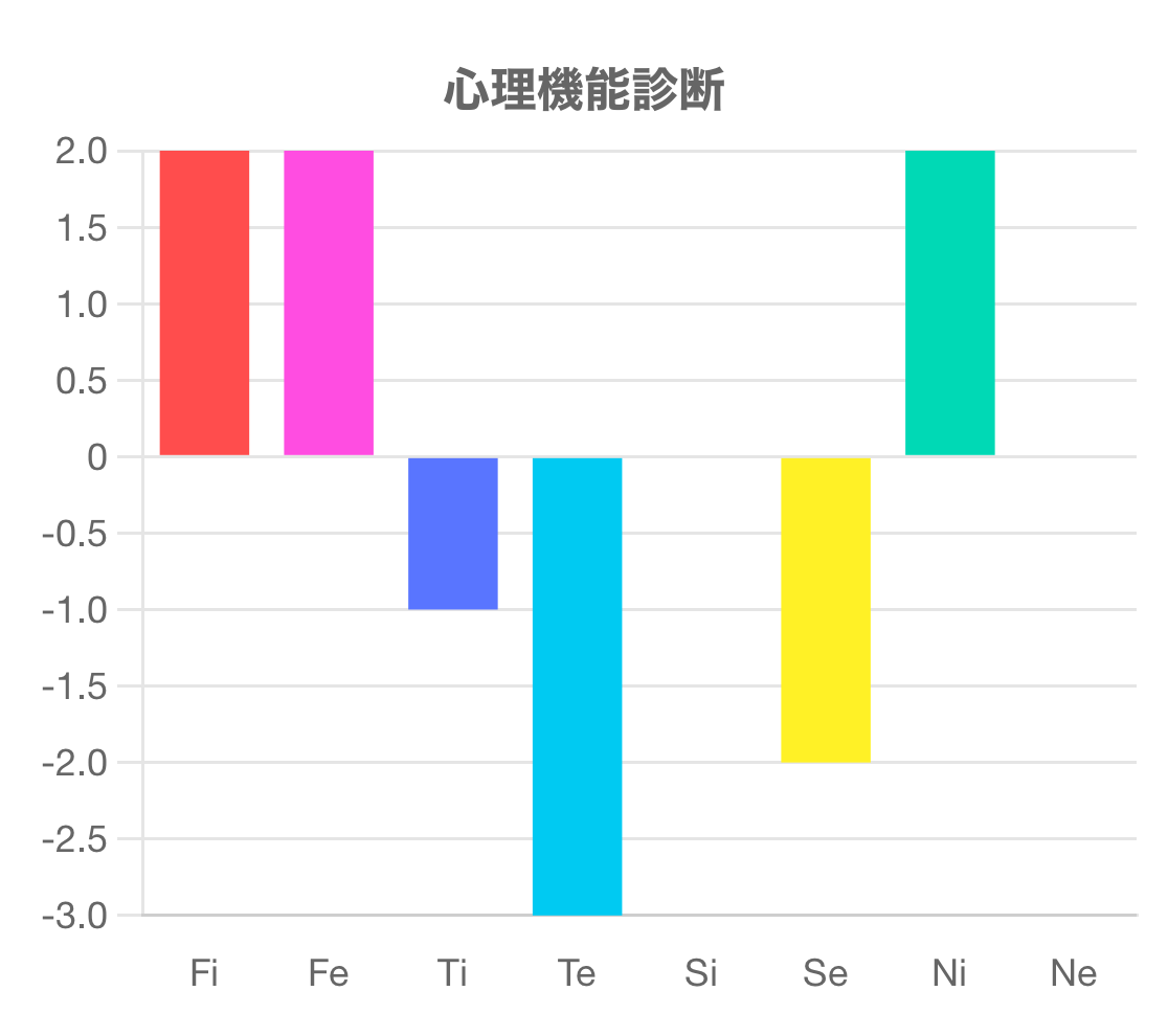 この診断テストは、Fi(内向的感情)、Fe(外向的感情)、Ti(内向的思考)、Te(外向的思考)、Si(内向的感覚)、Se(外向的感覚)、Ni(内向的直観)、Ne(外向的直観)の強さを測るものです。