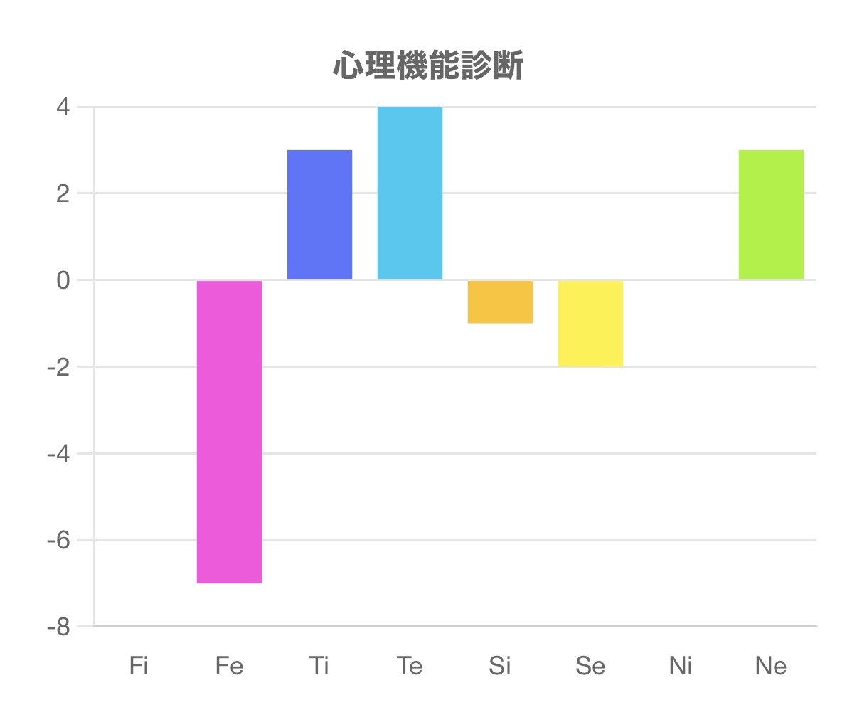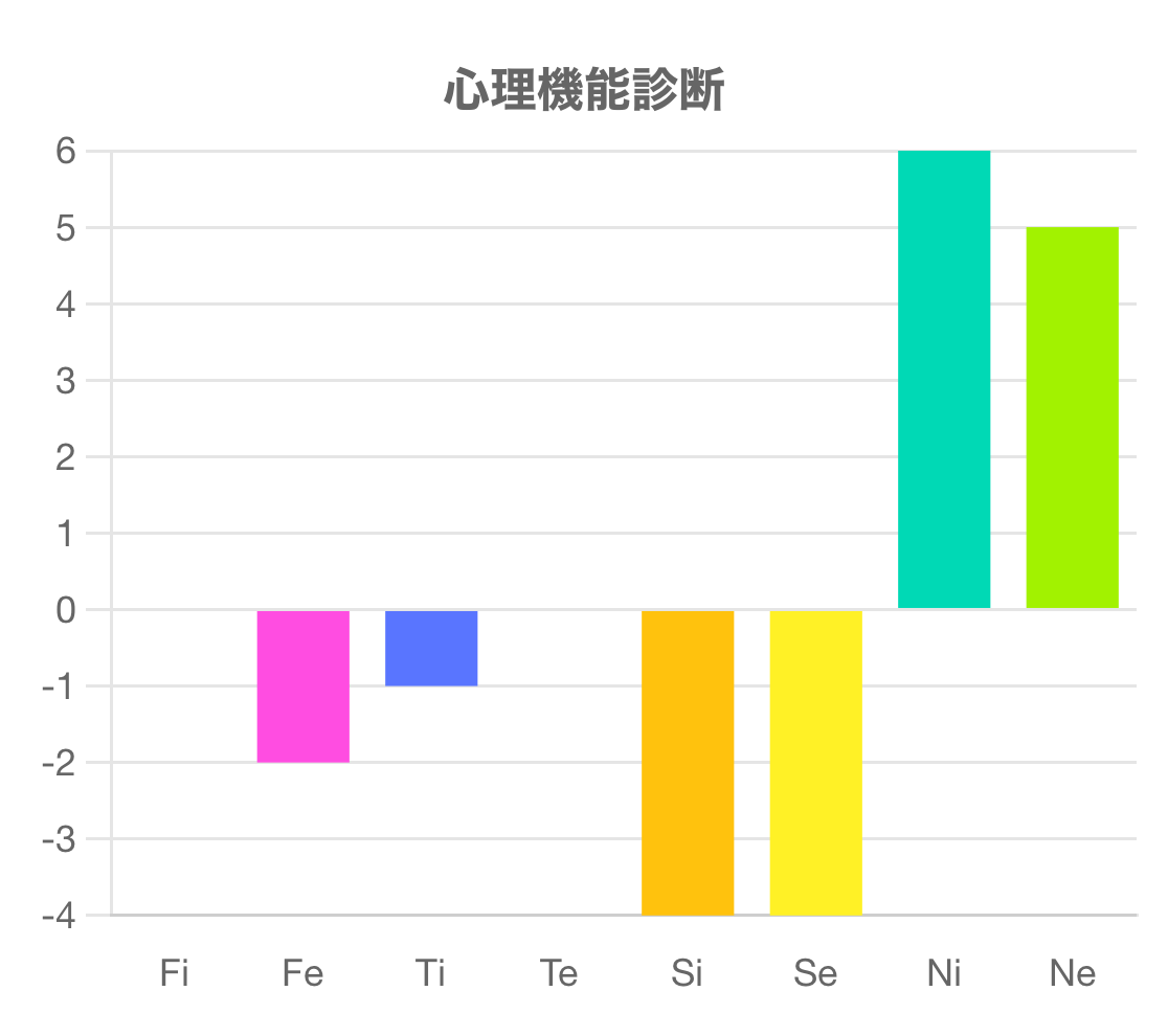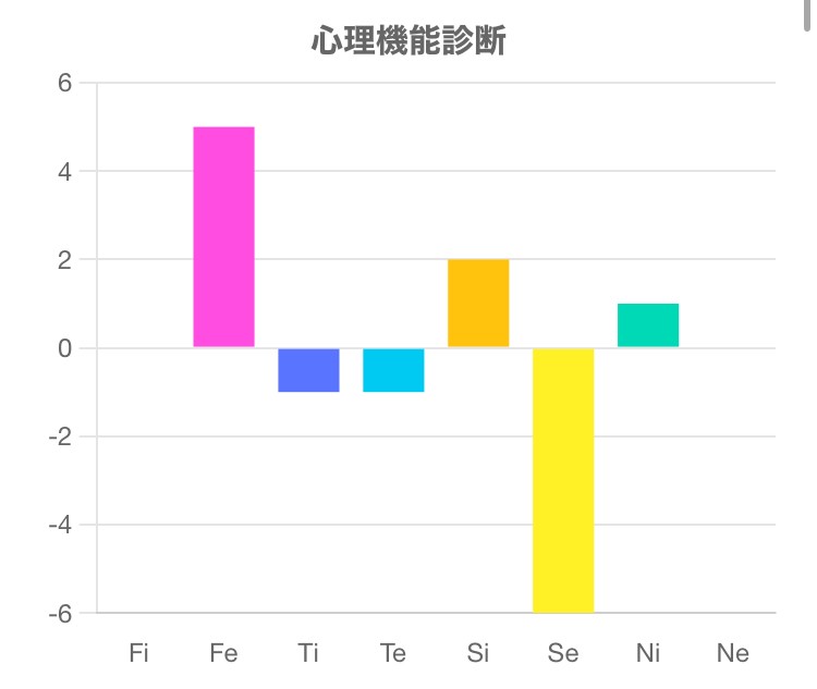 この診断テストは、Fi(内向的感情)、Fe(外向的感情)、Ti(内向的思考)、Te(外向的思考)、Si(内向的感覚)、Se(外向的感覚)、Ni(内向的直観)、Ne(外向的直観)の強さを測るものです。