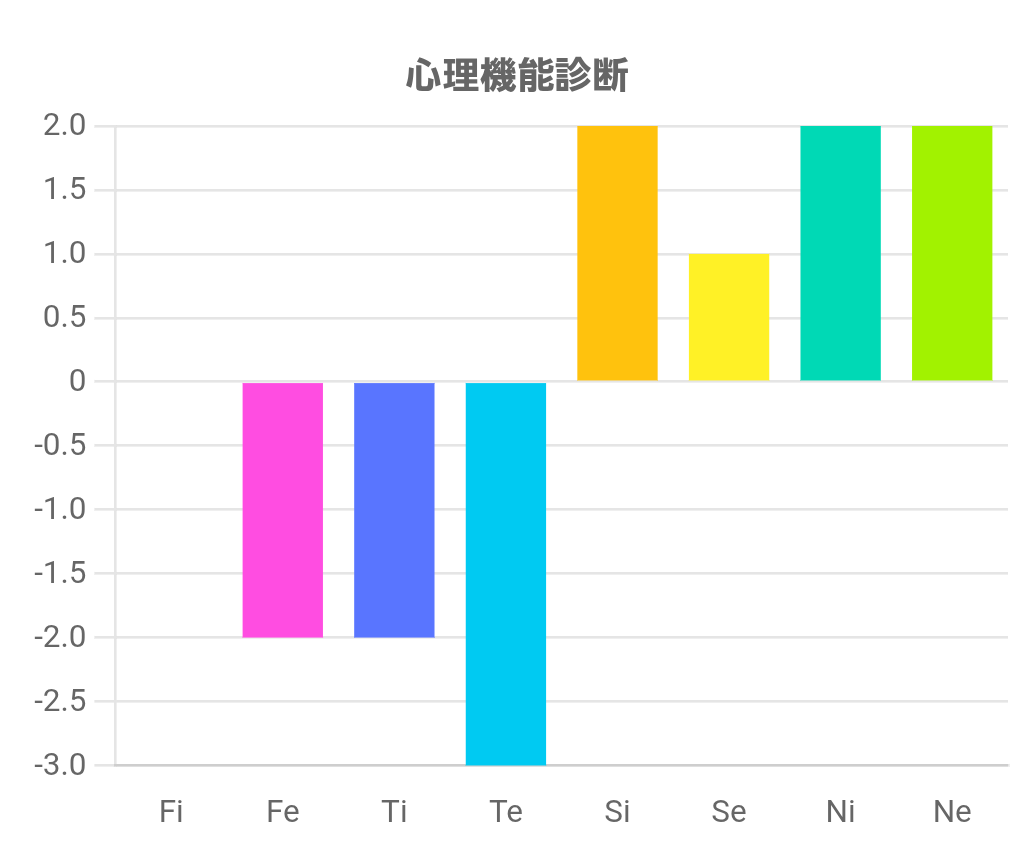 この診断テストは、Fi(内向的感情)、Fe(外向的感情)、Ti(内向的思考)、Te(外向的思考)、Si(内向的感覚)、Se(外向的感覚)、Ni(内向的直観)、Ne(外向的直観)の強さを測るものです。